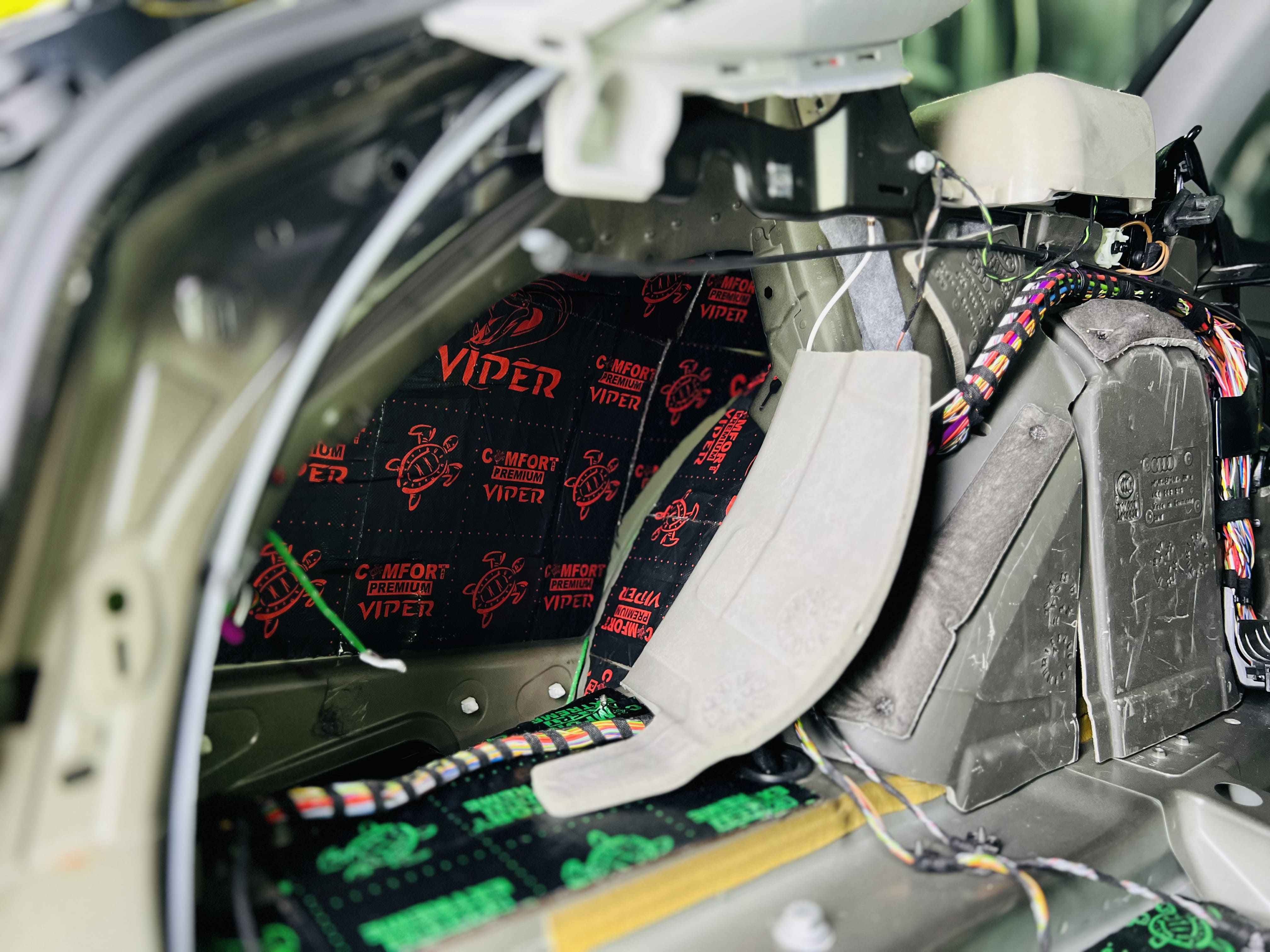 Финальным слоем на каркас двери нанесли виброизоляцию Comfort Mat Viper и идеально по размеру вырезали шумопоглощающие волны Comfort Mat Тишина Volna. Дверь багажника также завершили финальным слоем Тишина Volna.
