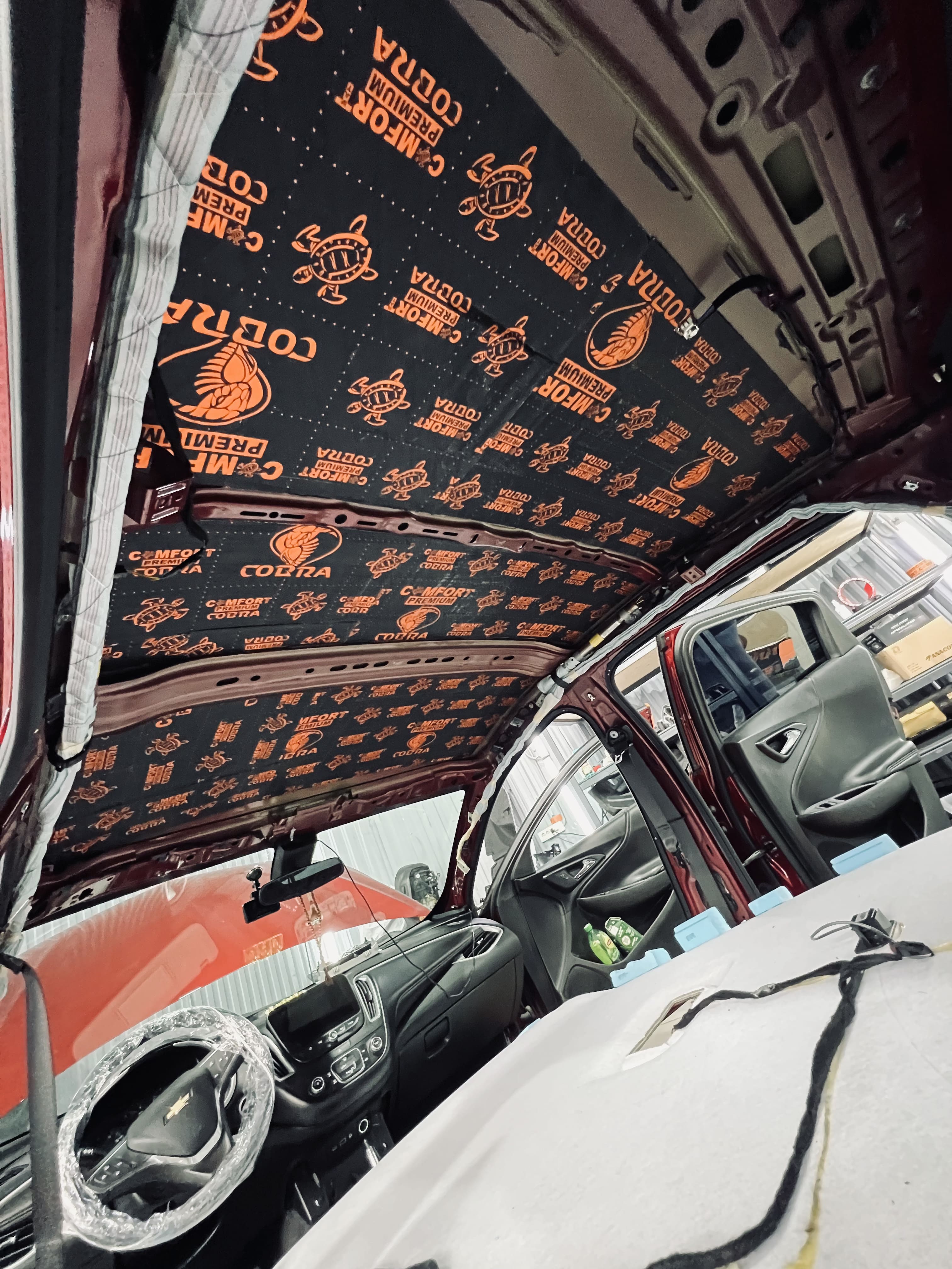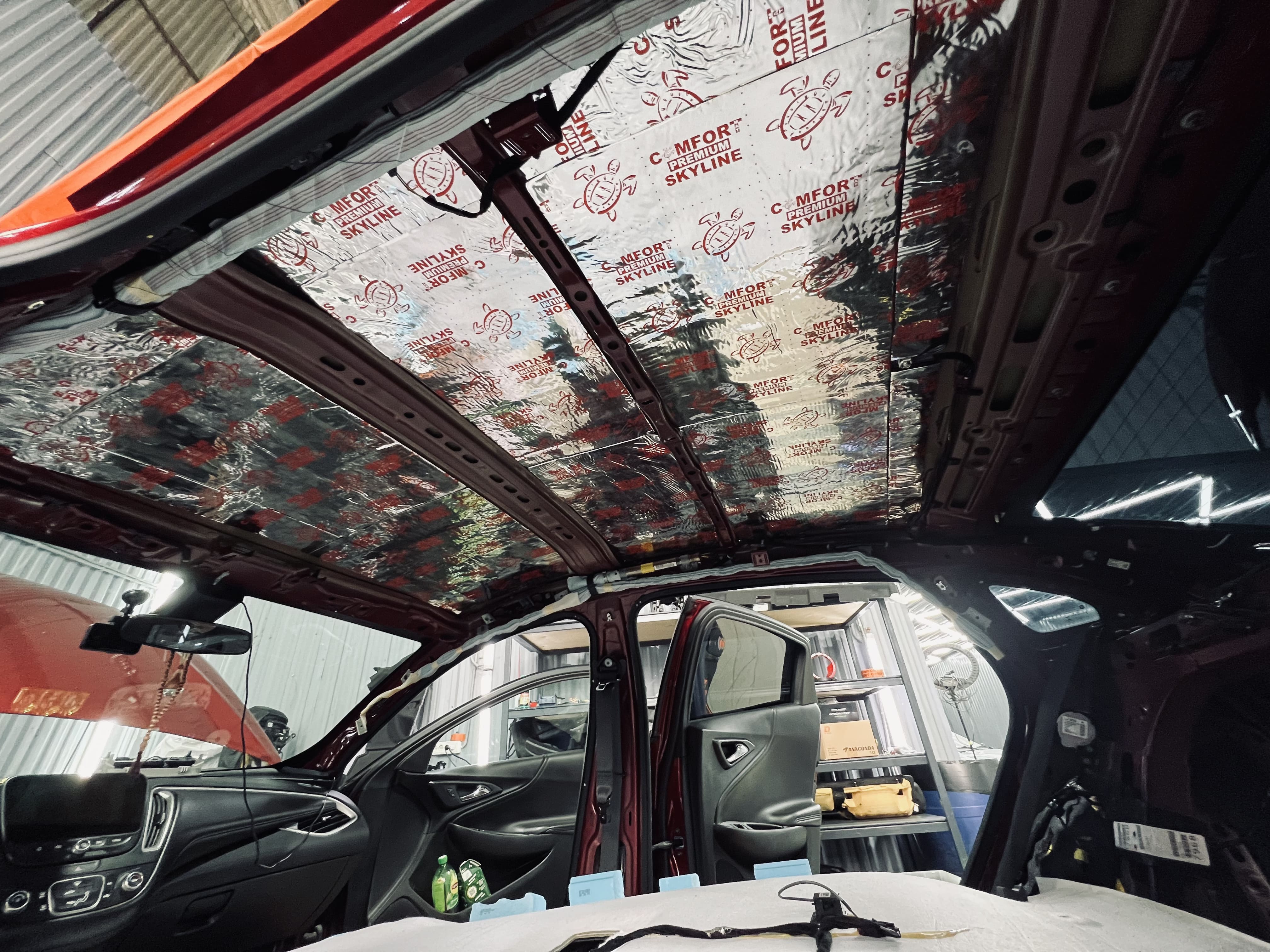 Вторым слоем уложили шумоизоляцию Comfort Mat Premium Skyline, легкий и эффективный материал, завершающий изоляцию.