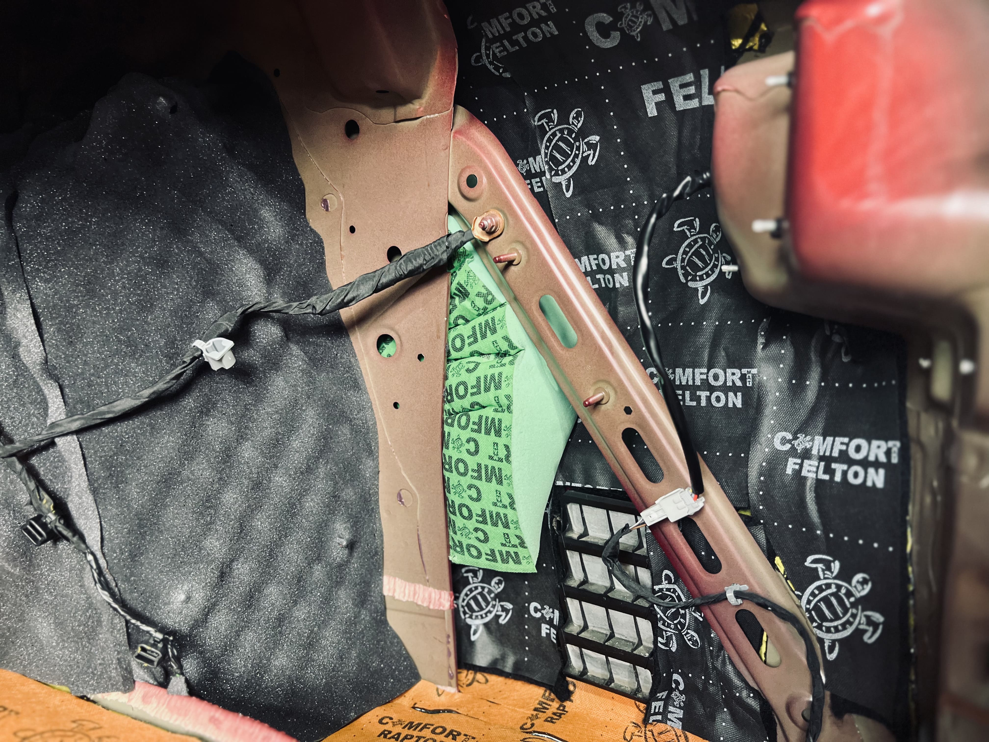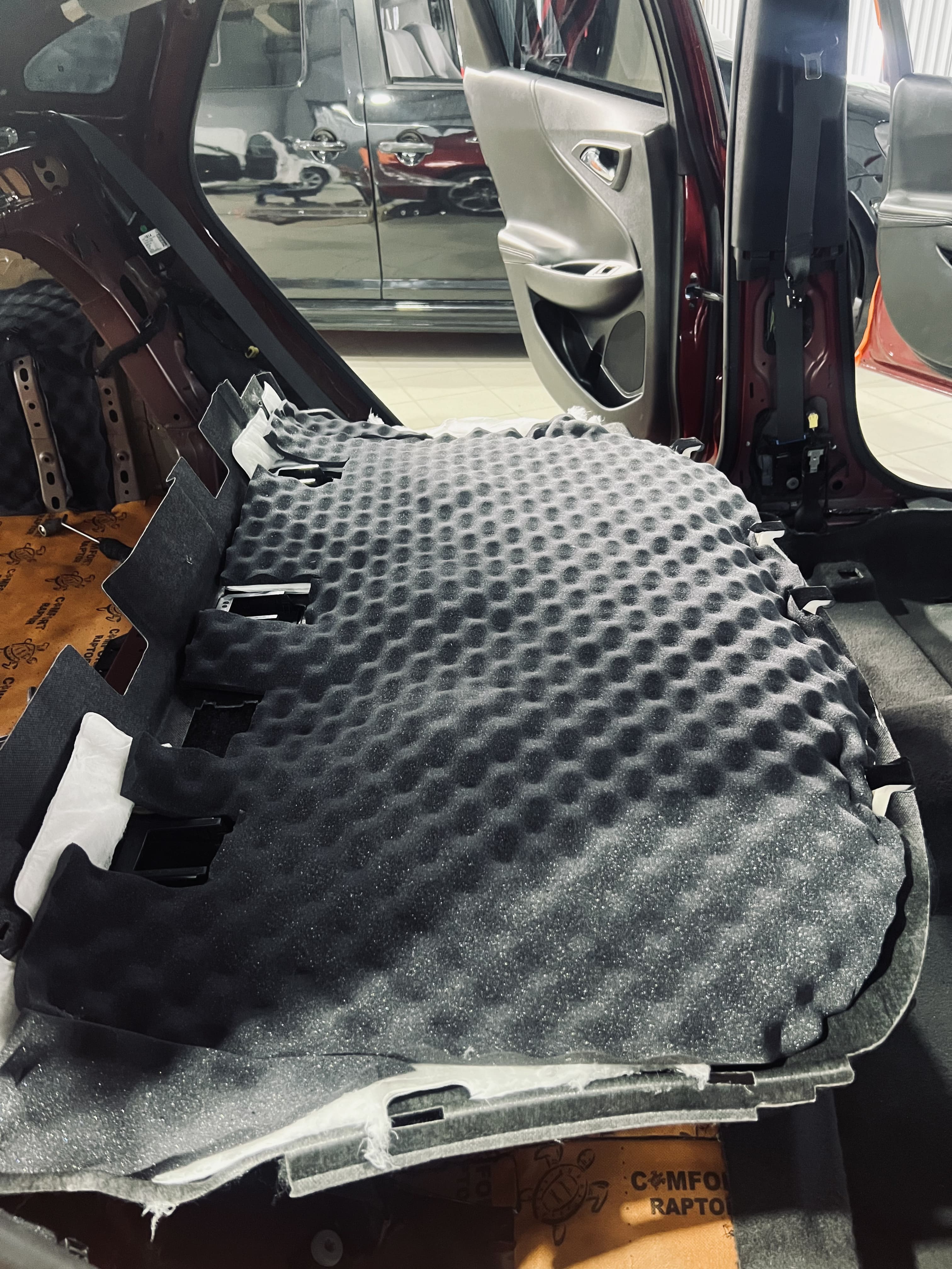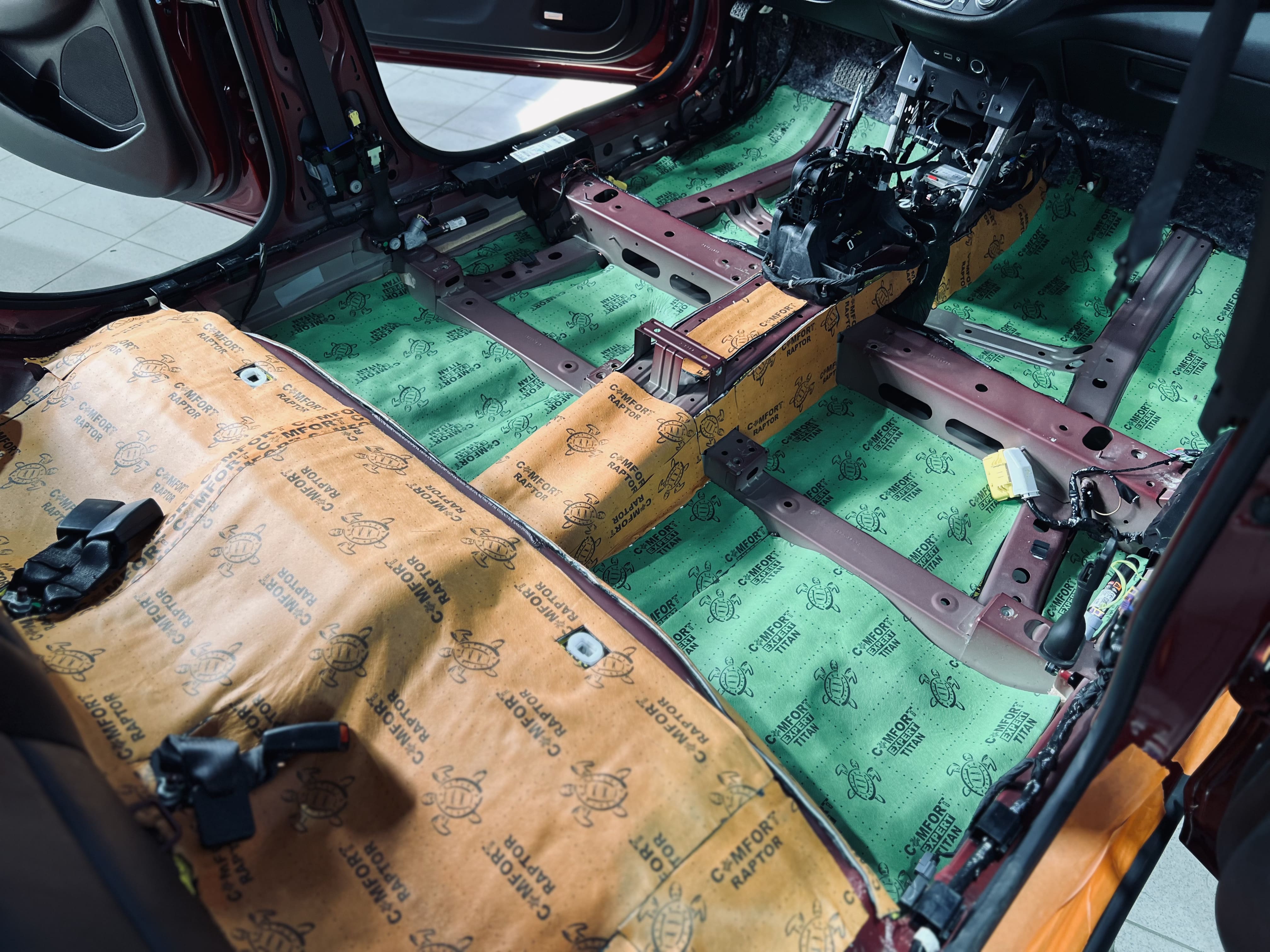 Вторым слоем в салоне применили комбинацию материалов: на дно – Comfort Mat Expert Titan, под задние пассажирские сиденья и в районе центральной консоли – Comfort Mat Raptor. На фото показаны готовые слои Expert Titan и Raptor, равномерно распределенные по днищу салона. Для закрытия швов и стыков мы использовали контурную ленту, подобранную в тон шумоизоляции, что не только повышает надежность, но и придает эстетичный вид, даже скрытый под ковровым покрытием.