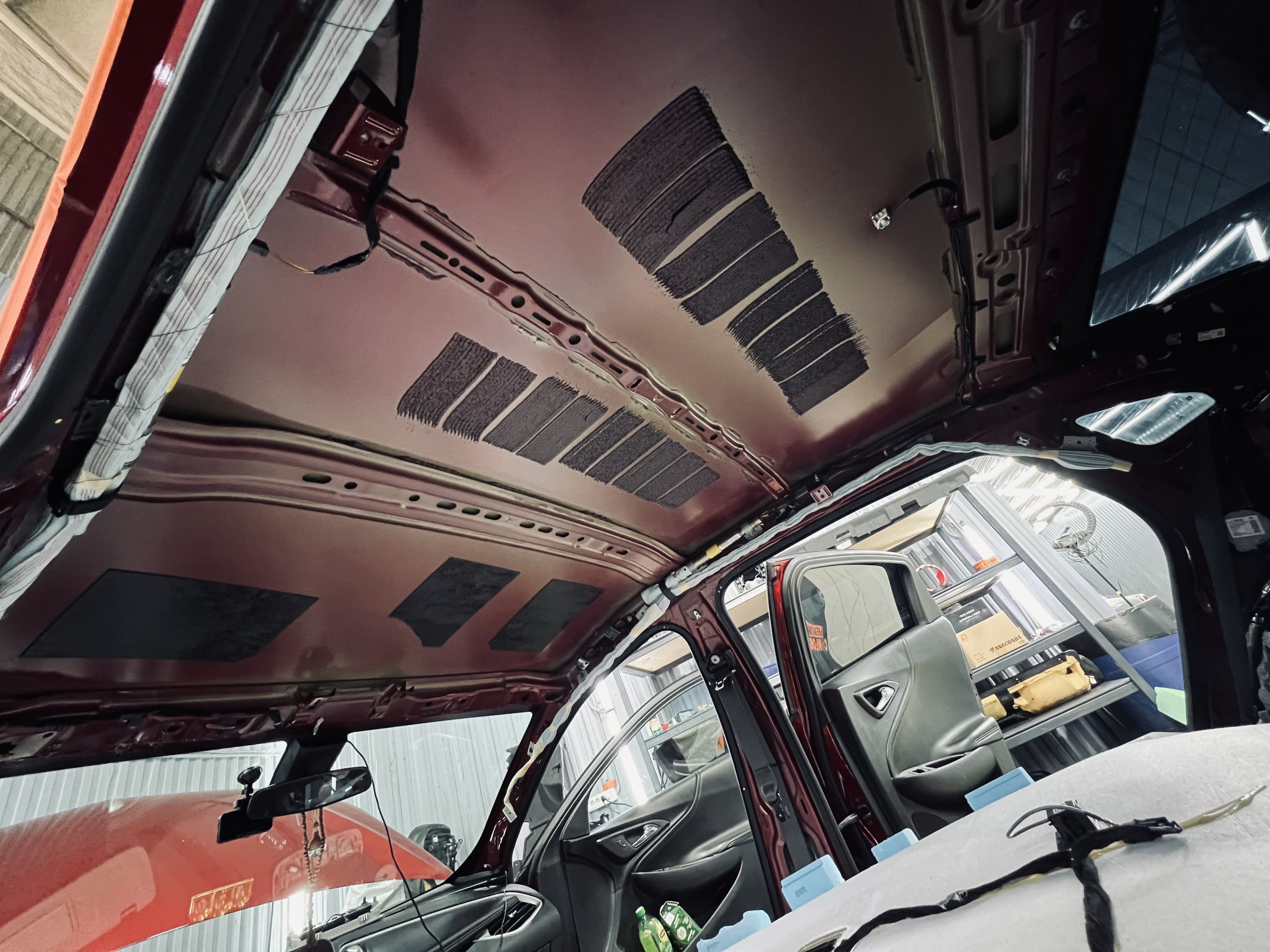 Работа началась с демонтажа потолочной обшивки, обнажив металлическую поверхность, мы подготовили крышу к шумоизоляции.