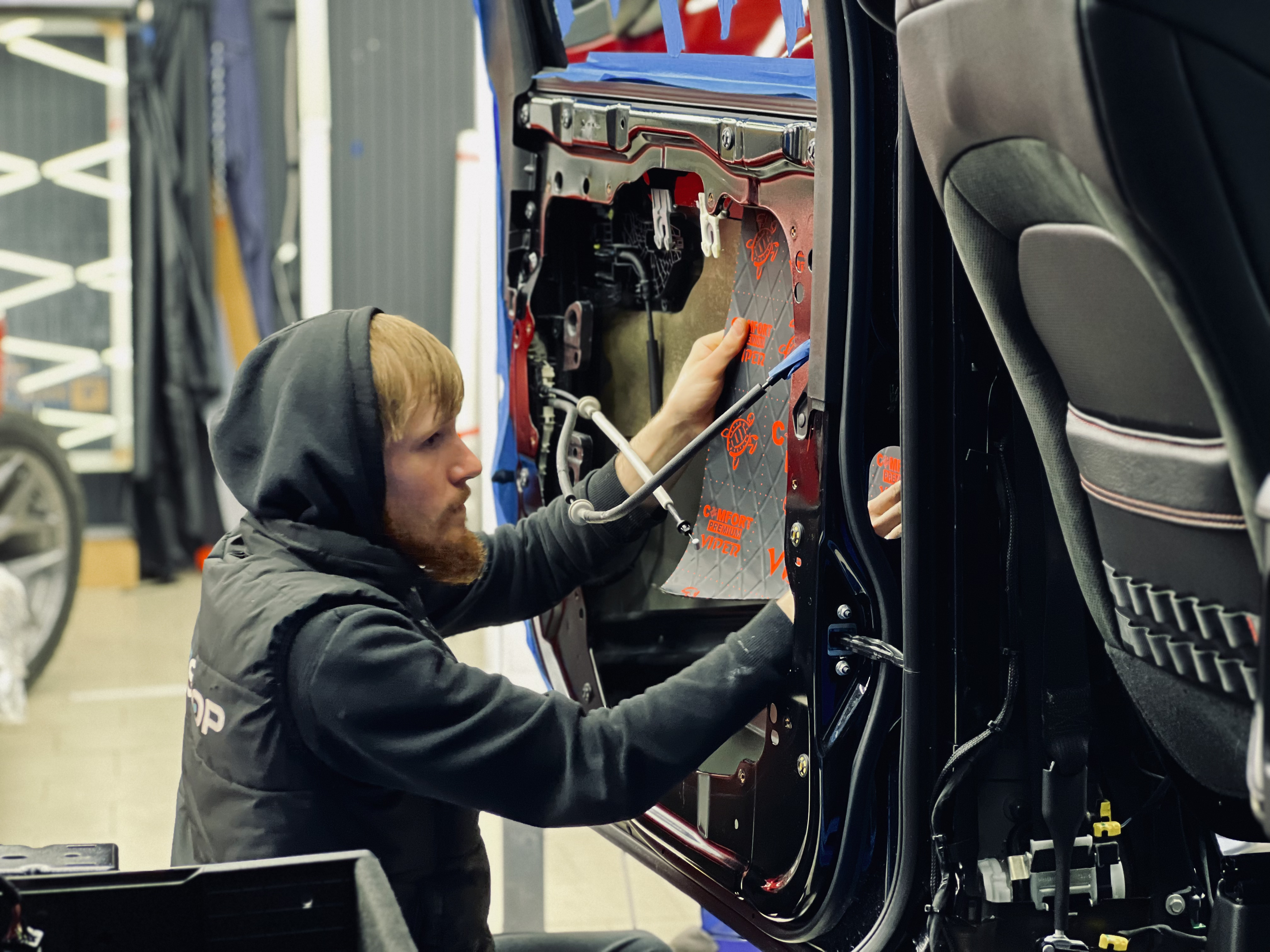 Двери – важный элемент шумоизоляции, через который проникают звуки улицы, ветра и двигателя. Мы обработали их в несколько слоев, чтобы обеспечить тишину и улучшить звучание акустики.