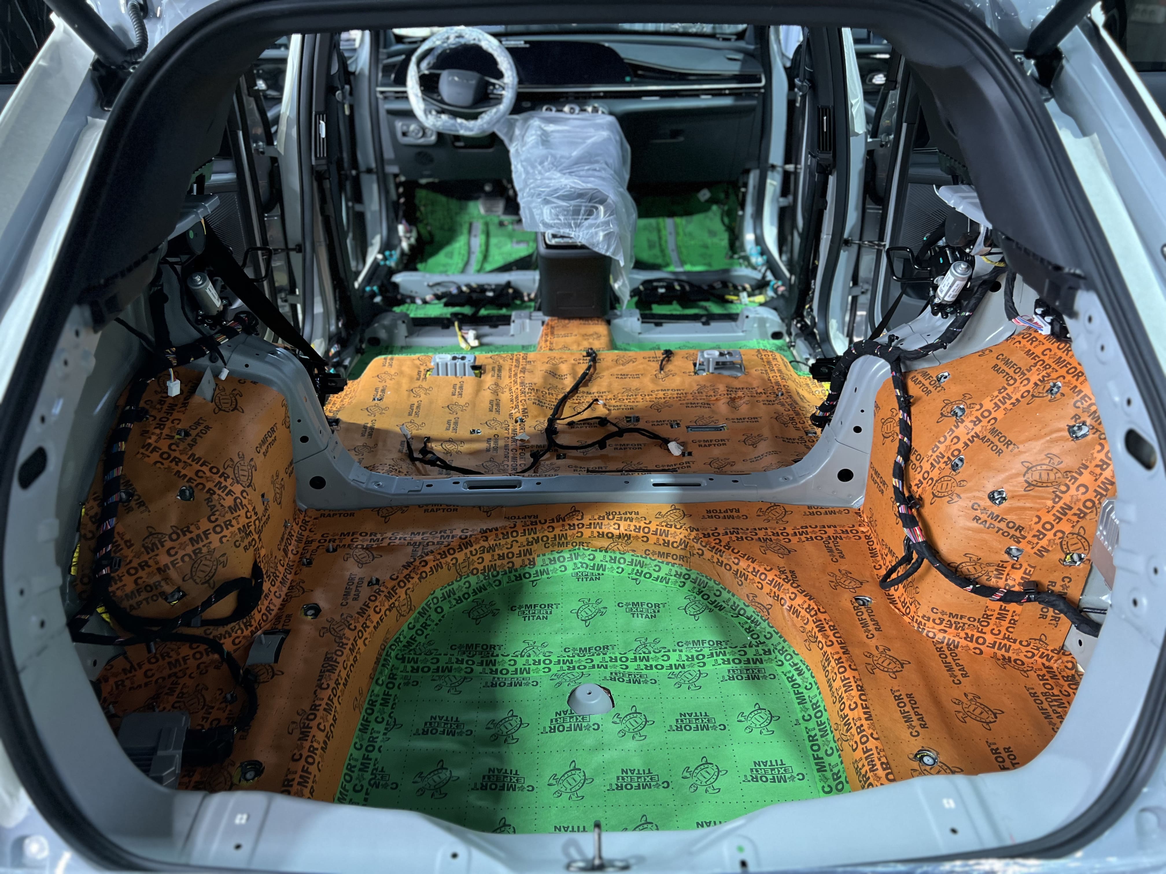 Багажник и днище – основные источники шума от колес, подвески и дорожного покрытия. Мы использовали многослойную изоляцию для устранения вибраций и гула.