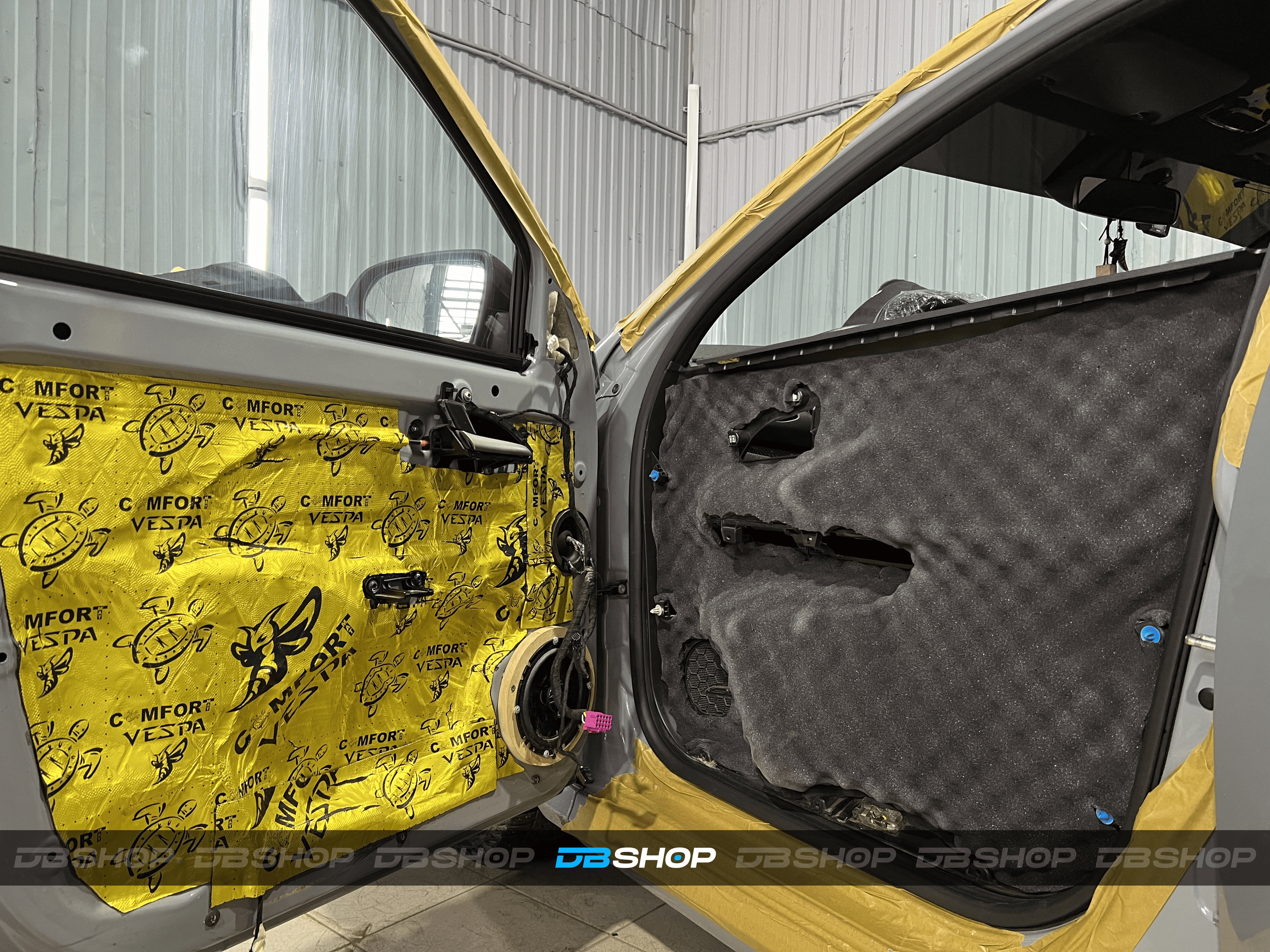 На двери и каркас двери нанесли виброизоляцию Comfort Mat Vespa и шумопоглощающие утолщенные волны Comfort Mat Тишина Volna, идеально вырезанные по размеру. Дверь багажника получила аналогичную обработку.