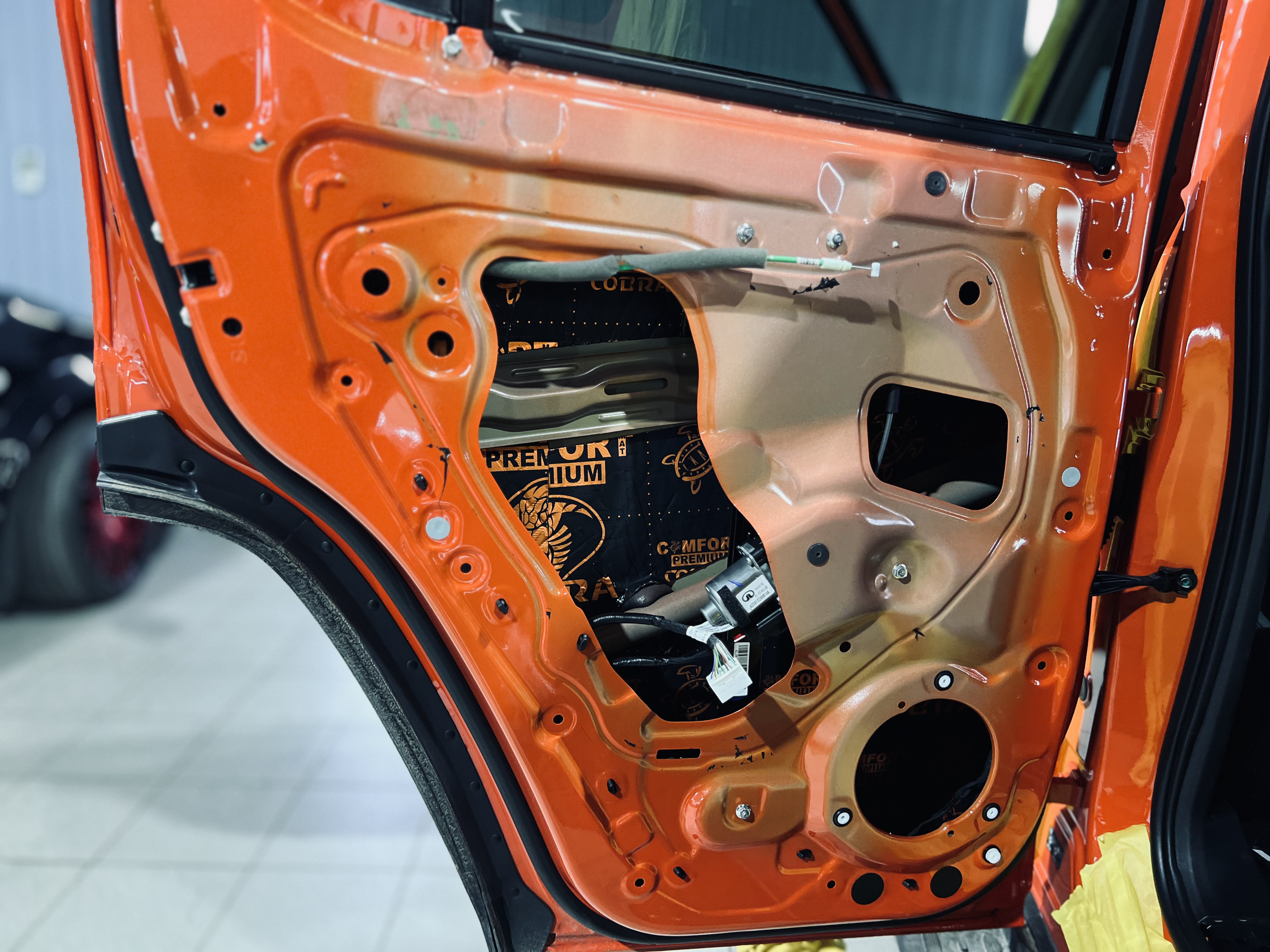 Первым слоем на двери нанесли виброизоляцию Comfort Mat Dark Cobra.